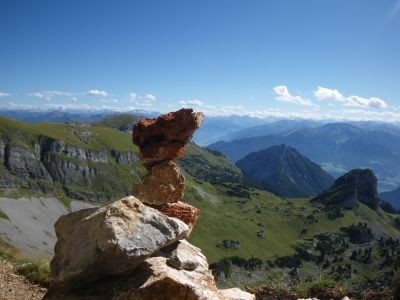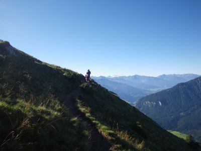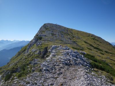 Von der Seekarlspitze steigen wir zunächst über einen Wiesenpfad ab und bleiben am Grat. Vom tiefsten Punkt führt ein Bergsteig zum nächsten Gipfel hinauf. Die dabei gesicherten Stellen als Klettersteig zu bezeichnen wäre wohl etwas übertrieben, denn eigentlich sind die Sicherungen wirklich nicht nötig. Nach kurzweiligem Wandern ist der vierte Gipfel auch erreicht.