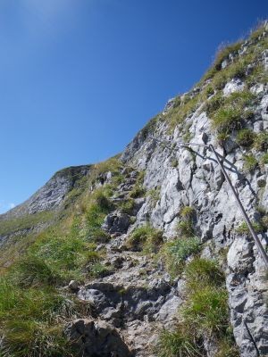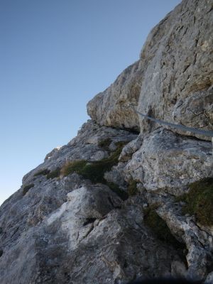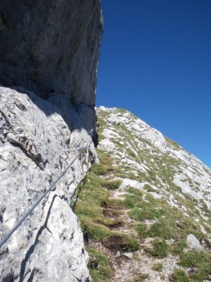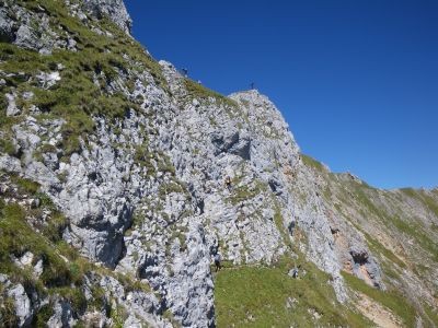 Unterhalb des Gipfels beginnt der Klettersteig. Dabei wird jedoch nur ein kurzes Band gequert. Wer hier noch nicht sein Klettersteigset anlegen möchte kann auch weiter rechts den Normalweg zum Gipfelkreuz wählen.