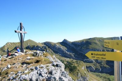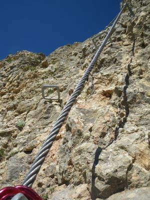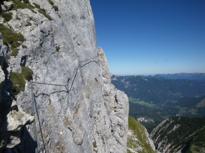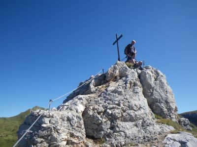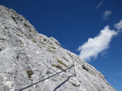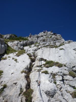 Gleich zu Beginn folgt der schwerste Teil aller Klettersteige: über eine steile Wand ohne schöne Henkelgriffe steigt man nun einige Passagen am Stahlseil bergauf. Nachdem es bald deutlich leichter wird folgt ein Wiesenband und nach einem weiteren Aufschwung sieht man das Gipfelkreuz eh schon über den Felsen. Über weitere Aufschwünge erreicht man das Gipfelkreuz nach gut 30 Minuten (Die Zeitangaben auf den Tafeln, wie auch in der Dokumentation auf der Homepage - siehe Weblinks sind deutlich zu großzügig angegeben). Von diesem geht es über den Grat nach Norden hinab, Ausgesetzte Stellen sind dabei gesichert.