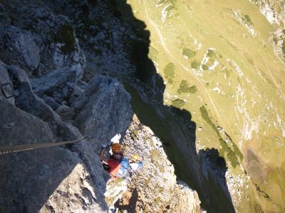 Der eigentliche Klettersteig wartet nun beim Abstieg: Dazu folgen wir dem Gratverlauf. Zwei kurze Stellen sind hierbei mit Drahtseilen an exponierten Stellen gesichert. Der eigentliche Klettersteig ist das kurze Stück am Fels in die Scharte Richtung Hochiss hinab. Viel ist dazu jedoch nicht zu erwähnen, denn abgesehen von zwei B-C-Stellen ist es meist leichter.