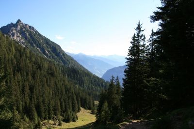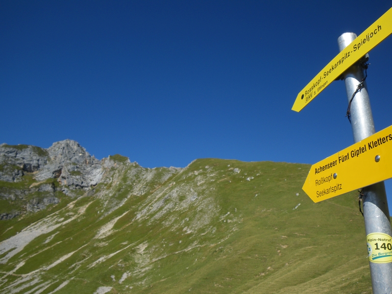 Der Abstieg erfolg nun auf dem Normalen Wanderweg. Dieser führt in Kehren in einem Bogen nach Westen über abgspeckten Fels zum Einstieg des Klettersteigs zurück. Von dort führt er unterhalb des Spieljochs Richtung Rofanseilbahn. Wer den Gschöllkopf mitnehmen möchte (Auf- und Abstieg von hier eine gute halbe Stunde & 110 Höhenmeter) geht am Wegweiser rechts und folgt dem einfachen Wanderweg hinauf. Über Treppenstufen schlängelt sich der Weg hinauf, ehe es deutlich flacher zum Adlerhorst geht. Der Abstieg erfolgt auf gleichem Wege bis zum Wegweiser. Von diesem geht es rechts in 15 Minuten zur Rofanseilbahn hinab.