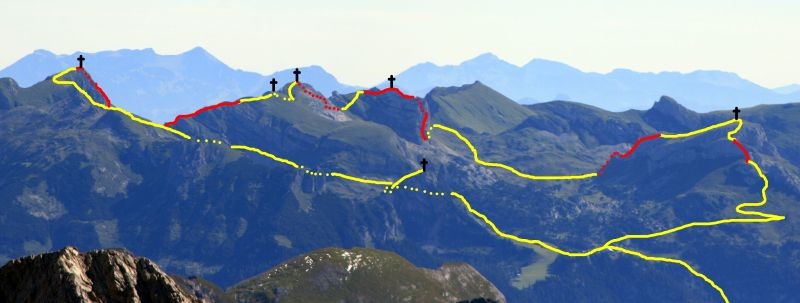 Der eigentliche Klettersteig folgt nun im Abstieg. Dazu geht man dem Bergrücken folgend etwas hinab. Dort wo der normale Wanderweg deutlich steiler rechts hinab geht folgen wir der Pfadspur weiter am Rücken nach Norden. Der Klettersteig führt nun kurz bergab über gestuftes Gelände, quert über eine Seilbrücke und geht ähnlich weiter bergab. Nach einer Gehpassage geht es noch einmal kurz zu einem Gipfelkreuz hinauf, ehe es über eine steilere Wand (schwerste Passage dieses Sektors) hinab geht. Nach einer kurzen Gehpassage folgt nochmals der Abstieg über platten Fels und schon ist der erste Steig vorbei.