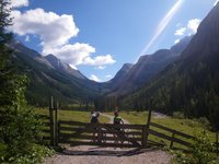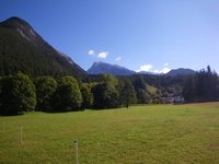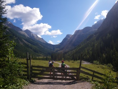 Wir starten in Scharnitz und überqueren die Isar. Auf der anderen Flussseite wählen wir gleich die erste Straße und fahren bis kurz vor das Ortsende. Nach wenigen Metern Bergab fahren wir links dem Wegweiser „Karwendeltal“ nach aus dem Ort hinaus. Der Weg wird bald zur Schotterstraße, die sich mäßig steil den Hang oberhalb der Isar hinauf schlängelt. Nach an einem imposanten Blick auf die Felswand östlich des Karwendelbachs wird die Straße immer flacher, bis es sogar länger bergab geht. Über mäßige Steigung erreichen wir dem Verlauf des Karwendelbachs folgend die Larchet-Alm, die wir rechts liegen lassen. Der weitere Weg bleibt ähnlich. Es werden weiterhin nur zäh Höhenmeter gewonnen, was sich erst hinter der wunderbar gelegenen Angeralm ändert. Wir fahren nun bergauf, bis wir in einer Rechtskurve über die Brücke den eigentlichen Anstieg zum Karwendelhaus erreichen. In Serpentinen gewinnen wir mit Blick auf die Alpenvereinshütte spürbar Höhenmeter. Kurz vor der Hochalm verlassen wir den Wald und nach den letzten Kehren ist nun endlich das erste Etappenziel erreicht.