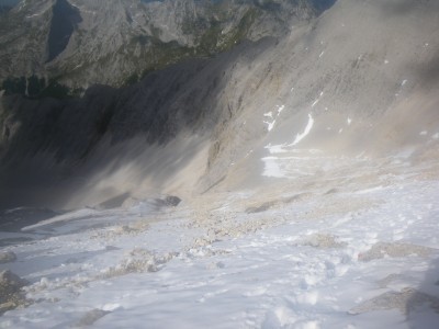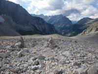 Direkt vor dem Karwendelhaus zweigt ein Weg links ab. Zwischen dem Lawinenschutz hindurch führt ein kleiner Steig, der teilweise gesichert ist. Schon bald öffnet sich jedoch der Ausläufer des Schlauchkars angenehm und wir wandern einfach zwischen Latschen taleinwärts. Kurz nach der Abzweigung zum Hochalmkreuz wird der Pfad spürbar alpiner und ehe man es merkt steht man im Schuttfeld. An Steinmandl orientieren wir uns zunächst nach links, wo wir am Hang Spuren hinauf entdecken. Bis unterhalb des Schlachkarkopfs führt der Weg relativ direkt hinauf. Ab dort geht es in Serpentinen nach Süden auf den Sattel zwischen Birkkarspitze und Ödkarspitzen. An der Birkkarhütte beginnt nun der Schlussanstieg, welcher teilweise Drahtseil gesichert ist. Nach wenigen Minuten stehen wir dann endlich am Gipfel und genießen die Aussicht auf das Karwendel und die Voralpen.