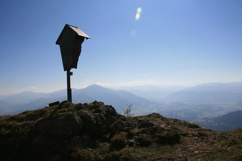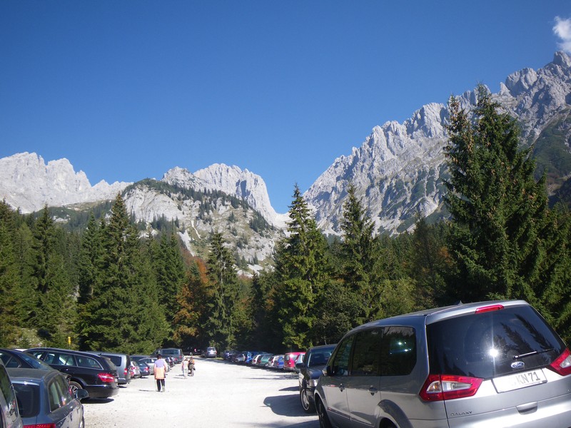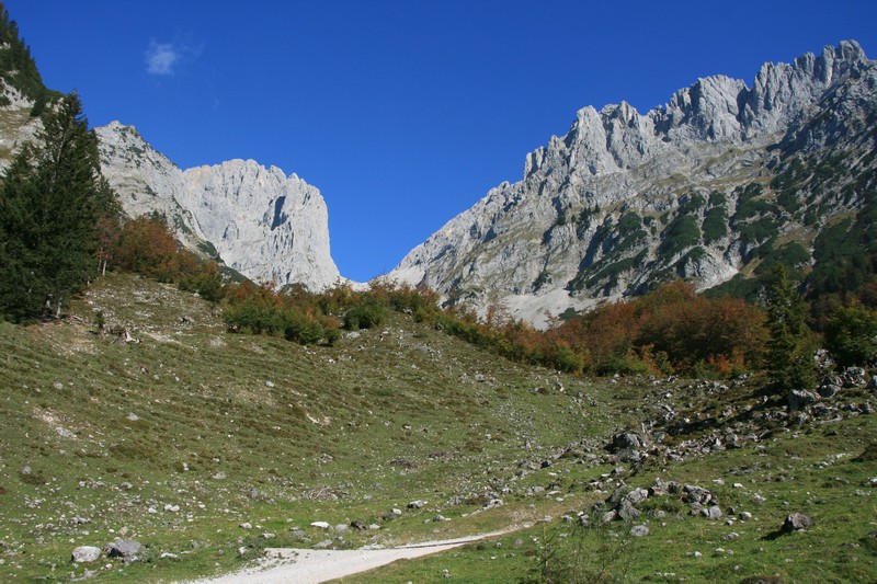 Wir starten an der Wochenbrunner Alm und wandern auf dem breiten Wanderweg mit Blick aufs Ellmauer Tor Richtung Gaudeamushütte. Nach einem anfänglichen sehr flachen Stück wird es kurz vor der Hütte nochmal etwas steiler, ehe man diese in einer knappen halben Stunde gemütlich erreicht. Am Schilderbaum neben der Alpenvereinshütte nehmen wir den Weg rechts am Waldrand hinauf. Nun deutlich ruhiger gehen wir noch ein Stück nach Süden, ehe der Weg nach rechts in den Wald führt. Über einen nun deutlich steileren und steinigeren Weg erreichen wir die Baumgartenalm nach einer weiteren halben Stunde. Zwischen den Hütten führt der Weg nun flacher nach Westen. Das Ziel im Blick steigen wir die letzten Meter auf den Sattel hinauf, von welchem das Bergsteigerkreuz in kurzen Augenblicken erreicht ist.