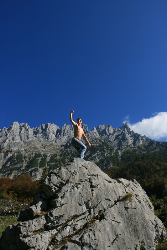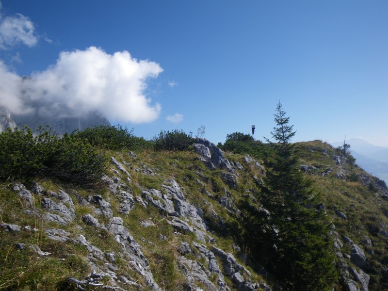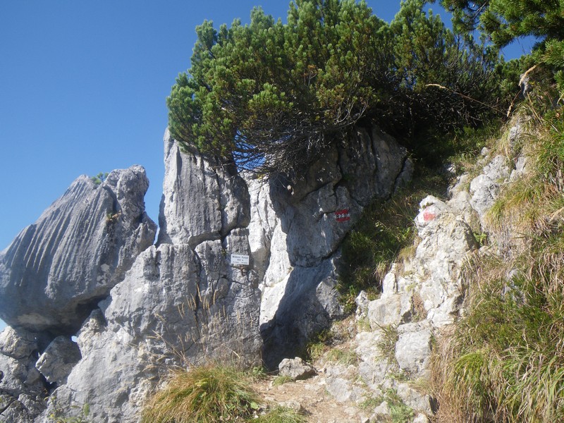 Wem die Tour bis hierher noch zu kurz ist kann weiter zur Wilderer Kanzel aufstiegen. Dazu geht man auf den Sattel zurück und wählt den Weg Richtung Kleinem Törl/Gildensteig. In Latschen geht es nun meist direkt auf die Felswand zu, bis der Fels erreicht wird. Am Fels geht es durch den Felsspalt auf den Balkon und blickt wie von einer Kanzel nach Osten zur Gruttenhütte sowie Treffauer und Ellmauer Halt, die sich hinter dieser erheben.
