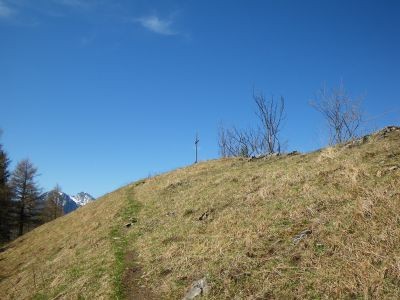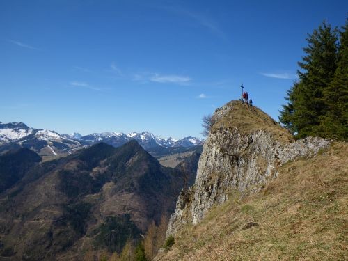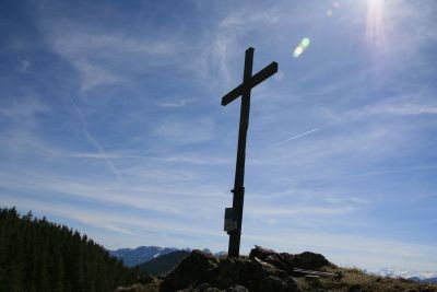 Wir steigen vom Madron auf dem gleichen Weg wieder bis zum Bauer am Berg ab und gehen zunächst auf dem Fahrweg Richtung Flintsbach hinab. Vor dem Normalweg zum Petersberg zweigt ein kleiner Weg auf Höhe der Sickergrube rechts ab. Auf einem mit Stahlseil gesicherten Bergsteig landen wir dabei am Gipfelkreuz des Petersbergs hinter dem Gasthaus.