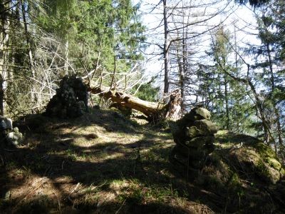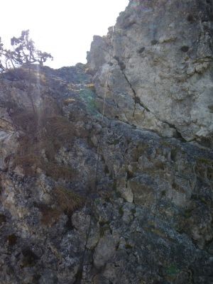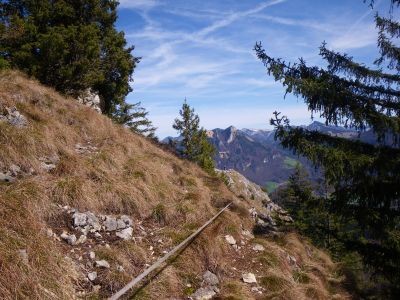 Die Maiwand ist mit Abstand der schwierigste Teil dieser Rundtour. Wer nicht schwindelfrei ist sollte den Gipfel auslassen, denn auch so ist die Tour schön. Für alle anderen geht es zum besagten Überstieg zurück. Hier halten wir uns links, und steigen bald schon ein Stück hinab. Um den folgenden Felsaufbau geht es links herum (nicht den deutlichen Pfadspuren nach oben folgen!). Am steilen Hang geht es nun meist relativ flach nach Norden, bis der Wald lichter wird und ein altes Seil den Weg vorgibt. Wir folgen dem Seil zunächst ganz einfach, bis wir etwa 4 Meter in eine Minischarte hinab klettern (schwierigste Stelle dieser Tour!). Ab dieser wird es wieder leichter und wir gehen etwas ausgesetzt, aber unschwer zum Gipfelkreuz.