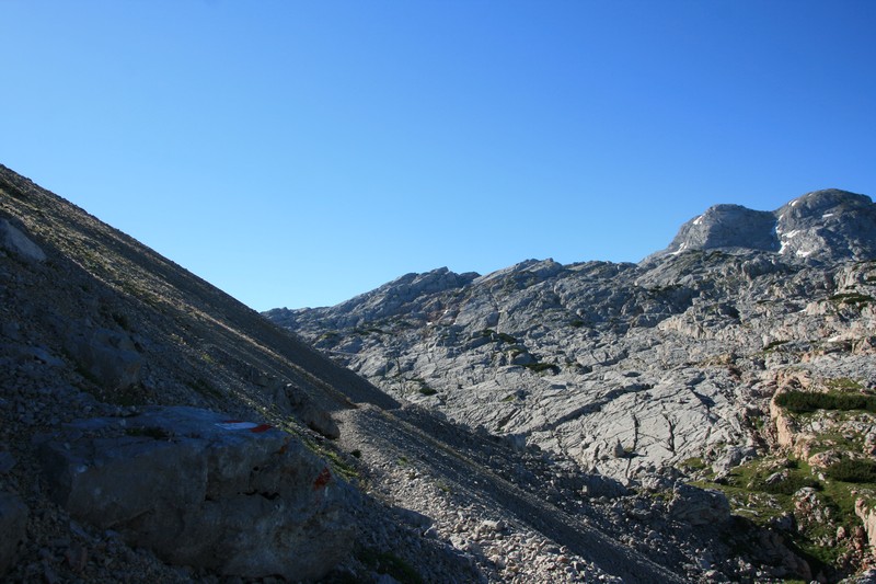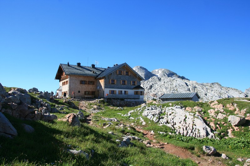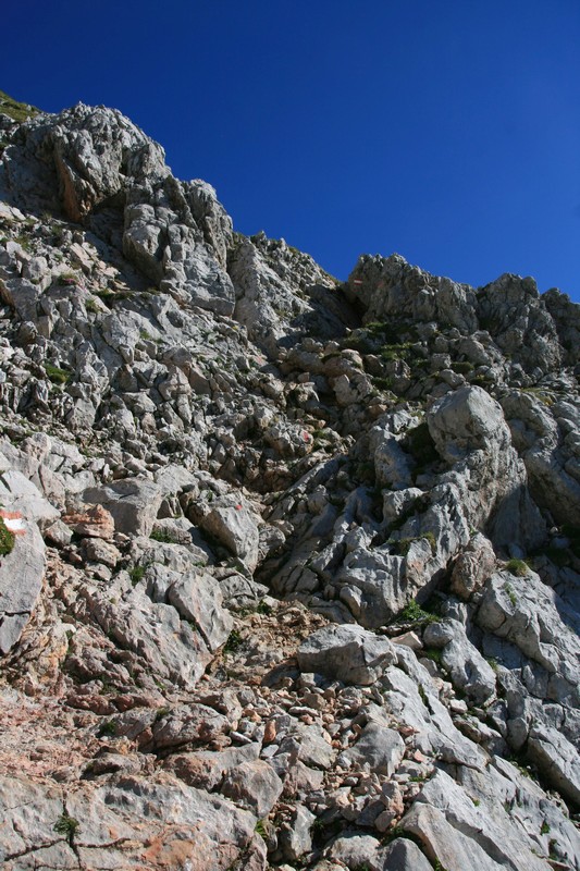 Links der Materialseilbahn geht es leicht nach Norden. Der Aufbau der Felswand lässt vermuten wo es weiter geht. Bald zweigt der Weg zum Seehorn ab, und der Aufstieg führt entlang des Hundstods auf das Plateau über der Felswand. Nach einem kurzen flachen Stück folgt eine weitere Stufe und kurz darauf ist das Ingolstädter Haus zu sehen. Dorthin ist es dann auch nicht mehr weit.