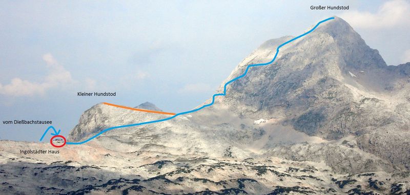 Vor dem Alpenvereinshaus geht man gleich links. Über nun deutlich felsigeres Gelände und einige Blöcke gewinnt langsamer an Höhe, hat das Tagesziel jedoch stets in den Augen. Bald schon wird die Senke zwischen Großem und Kleinen Hundstod erreicht. Der Weiterweg wird nun deutlich steiler. Zunächst geht der Pfad in einen richtigen Bergsteig über, ehe leichte Kraxelei immer wieder notwendig ist. Teils mühsam geht es immer weiter hinauf. Auf dem letzten Drittel hat man dann stets das Gipfelkreuz im Blick, welches jedoch trügerisch nahe erscheint. Oben angekommen erwartet einen durch die exponierte Lage en umfassendes Panorama zu nahen und fernen Gipfeln. Besonders zu erwähnen ist hierbei der Blick auf das Steinerne Meer sowie den Watzmann samt Abstiegsroute von der Südspitze.