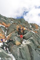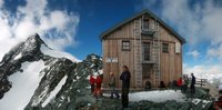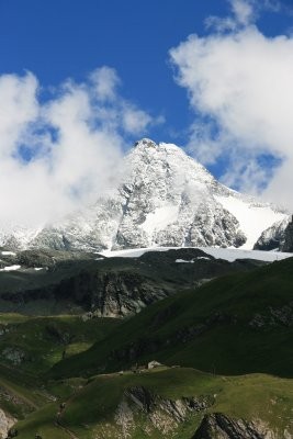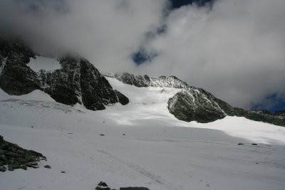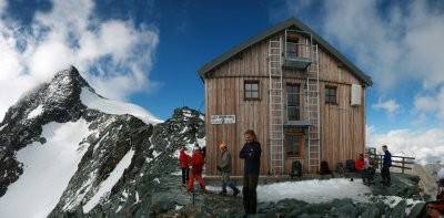 Der weitere Anstieg zur Erzherzog-Johann-Hütte erfolgt zunächst noch über Schiefergestein, ehe wir die ersten Ausläufer des Gletschers erreichen. Nach Passagen mit durchnässtem Schnee und Wasserläufen bietet sich auf gut 3000 Meter eine Steinansammlung zum Anlegen der Gletscherausrüstung. In einem weiten Bogen steigen wir auf dem Ködnitzkees auf, bis wir den Rest des Ewigen Eises auf 3240 Meter wieder verlassen. Nach einem kurzen Drahtseil gesicherten Stück treffen wir auf gut 3300 Meter auf die Aufstiegsvariante Mürztaler Steig. Mit diesem Weg zusammen steigen wir zuletzt zur Erzherzog-Johann-Hütte auf.