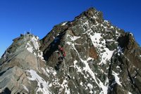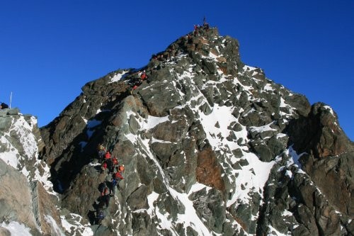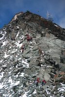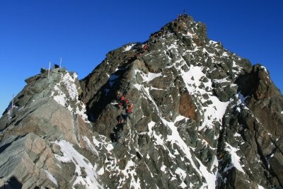 Vom Kleinglockner steigen wir zunächst am Stahlseil hinab in die Obere Glocknerscharte hinab. Über einen 50 Zentimeter schmalen vereisten Übergang geht es die letzten Meter wieder hinauf zum Großglockner. Vor allem in der Scharte und am letzten Aufschwung herrscht dabei eine große Staugefahr, die bei Überlastung der vorhandenen Infrastruktur schnell gefährlich werden kann.