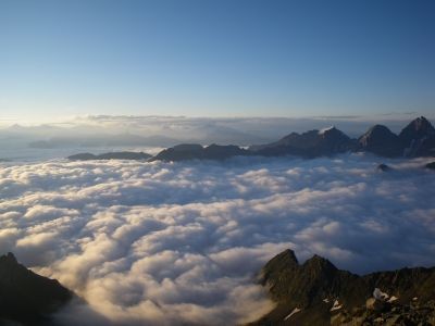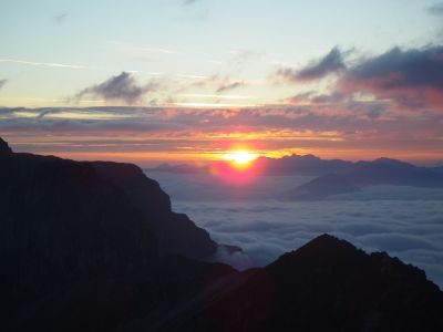 Den Gipfelanstieg am nächsten Tag startete ich bereits um 5 Uhr um den Massen nach dem Frühstück am Aufstieg zu entkommen. Das hieß zunächst mit Stirnlampe zu gehen. Die Wegmarkierungen sind hier jedoch so zahlreich, dass das Verlaufen fast nicht möglich ist. Nach circa 45 Minuten ging dann die Sonne hinter dem Karwendel auf - ein passender Zeitpunkt um zu frühstücken und die Lichtspiele über dem Nebelmeer zu bestaunen.
