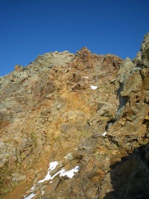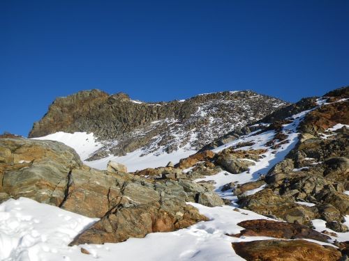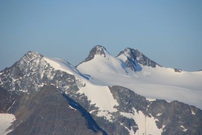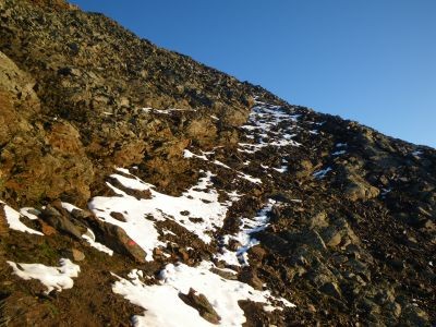 Nun folgten die ersten Seilsicherungen. Eigentlich sind diese hier nicht nötig, aber mit ihnen bleibt der Gipfel eben auch für ambitionierte Wanderer möglich. Über viele lose Steine (Steinschlaghelm!), und Blockwerk gewinnen wir weiter an Höhe, ehe die nächsten Seilsicherungen erreicht werden. Hinter diesen geht es über Blockwerk auf die Südseite des kleinen Gletschers, der direkt gequert werden kann. Der eigentliche Weg geht links herum und führt anschließend auf dem Ostrücken mit Blick auf den Gipfel zur Gipfelflanke hinauf. Nach weiteren Abschnitten über Steine erreicht man zuletzt Seilsicherungen, die bis unter den Gipfel führen.