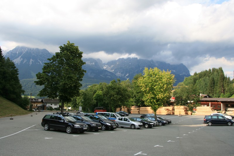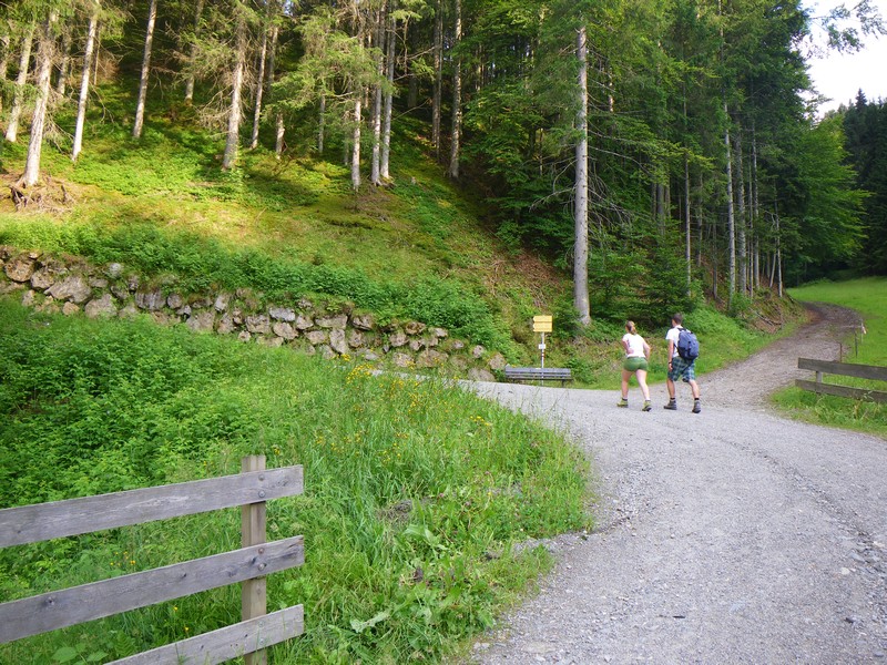 Wir starten an der Talstation der Hartkaiserbahn und gehen zunächst auf dem breiten Weg auf den Berg zu. Der Weg führt dabei um die Hausleitenstube herum, und weiter in einigen Kehren immer weiter in den Wald hinein. Wir folgen dabei stets den Wegweisern zur Bergstation Hartkaiserbahn bzw. zur Rübezahlalm.