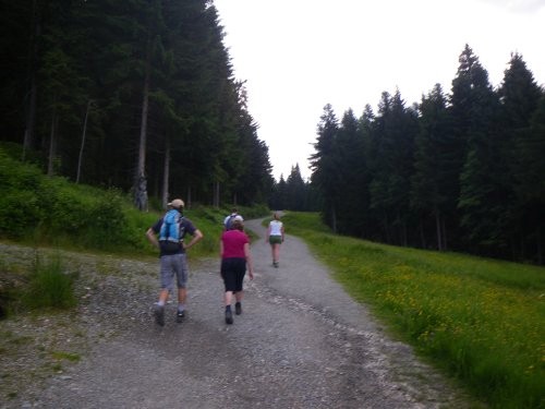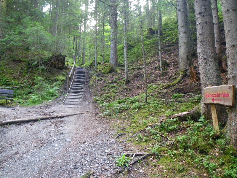 Auf circa 100 Metern verlassen wir den breiten Weg an einer Bank nach rechts. Nach einem kurzen Stück auf dem Pfad erreichen wir die Skipiste und wandern an deren Rand bergauf und queren nach links unter der Standseilbahn hindurch. An der kommenden Weggabelung gehen wir links den direkteren Weg zur Rübezahlalm, welche nach wenigen Metern rechts am Wegrand liegt.
