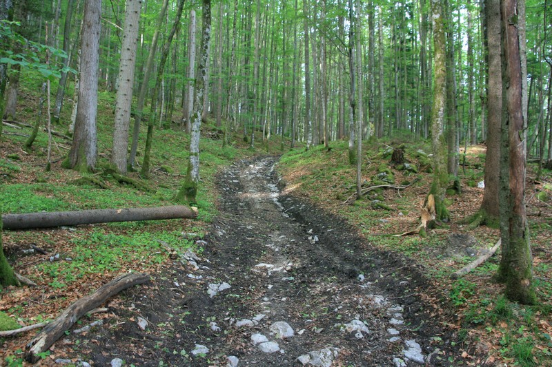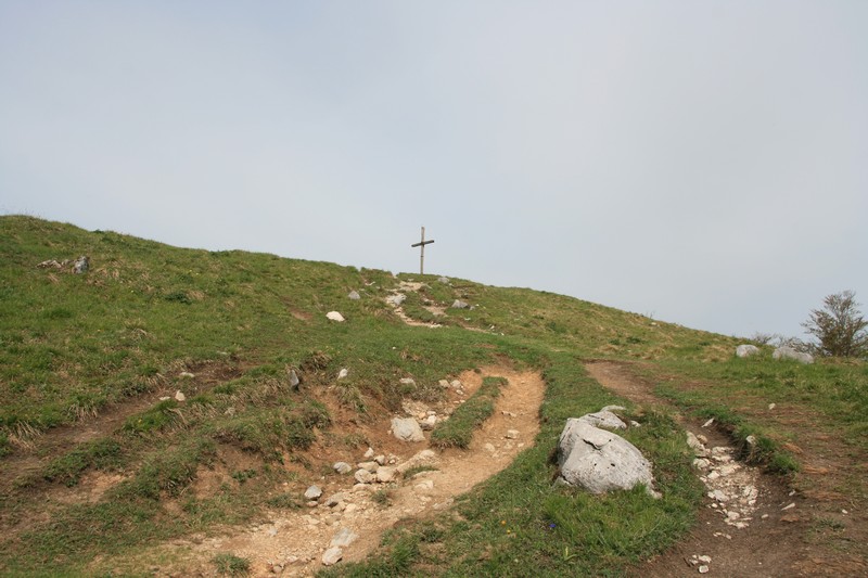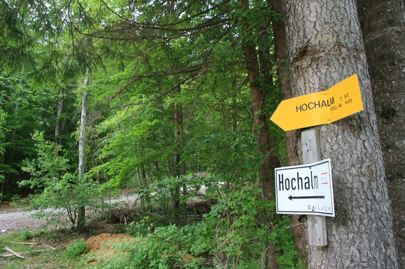 Dieser Fahrweg wird jedoch direkt überquert. In unzähligen Kehren schlängelt sich der Bergsteig nun zwischen zwei Bächen hinauf, wobei mit zunehmender Höhe es immer mehr an den Bach des Hochalmgrabens geht. An einigen Quellen vorbei wird der Berg nun etwas flacher und man kann die Almfläche schon erahnen. Sobald man den Wald verlässt führt der Weg noch kurz nach Süden zu den Überresten der Almhütten um dann zum höchsten Punkt samt Gipfelkreuz zu führen.