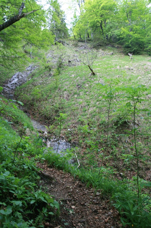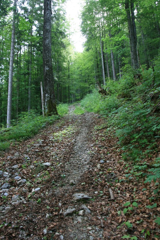 Die Tour beginnt direkt an der Straße. Zunächst folgt man dem breiten Forstweg nach Süden in den Wald, geht jedoch schon nach wenigen Metern in der Spitzkehre links, umgeht eine Schranke und bleibt auf diesem Weg nun ein paar Minuten. Bald leiten Wegweiser rechts auf einem schmäleren Weg hinauf. In einigen Kehren folgt man nun diesem Weg nun bergauf, und überquert schon bald den Bach in einer Furt. Wenige Meter dahinter zweigt rechts erneut ein Weg ab, den man wählt. Nachdem der Bach erneut überquert ist wird es zunehmend steiniger. Leicht nach Süden folgend erreicht man nach einem guten Drittel der Tour nochmals einen breiten Fahrweg.