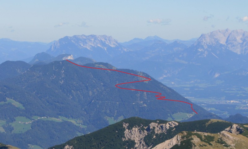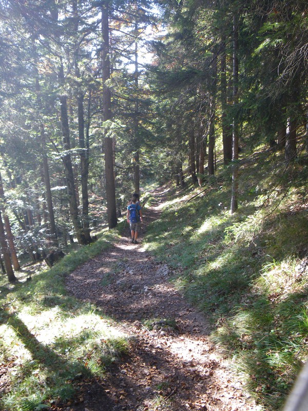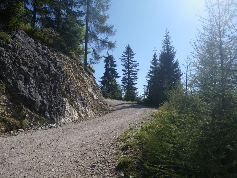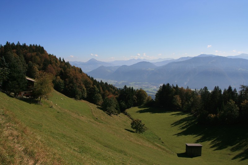 Wir starten am kleinen Parkplatz oberhalb des Gasthauses und gehen wenige Meter zur Schotterstraße zurück. Auf dieser folgen wir nun den Wegweisern zur Jocheralm. Die Straße zieht sich nun in einigen Kehren sanft steigend hinauf. Wem dies zu monoton ist kann auch über den „Alten Steig“ direkter aufsteigen. Dieser Weg führt meist direkt den Hang hinauf, ist dabei aber nur selten steil. Wer auf dem Fahrweg bleibt genießt zwischen den Bäumen immer wieder Blicke zwischen den Bäumen hindurch und die Vorfreude auf das Gipfelpanorama. Nachdem der Weg nach einer dreiviertel Stunde flacher wird wandern wir in lichtem Wald gemütlich zur Jocheralm, von welcher aus sich nun die erste Blicke auf den Alpenhauptkamm öffnen.