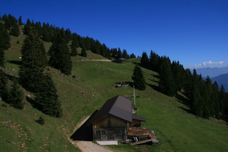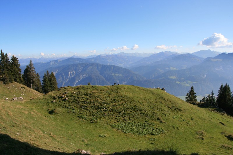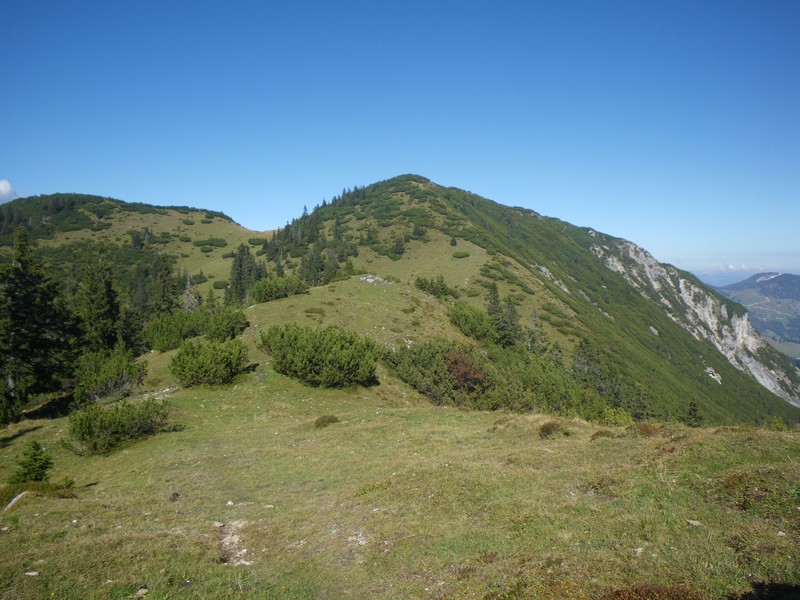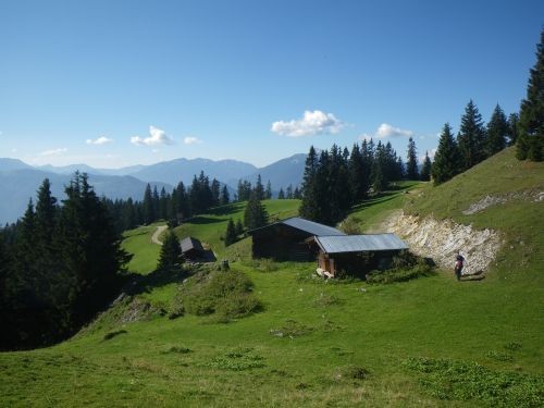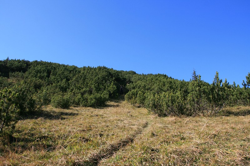 An der Jocheralm gehen wir in einem Bogen zur oberen Hütte und steigen anschließend links auf dem Wiesenweg auf. Auf einem schwach ausgeprägten Weg zieht sich das Weglein auf einen Bergrücken hinauf, von dem aus wir um den Heuberg links herum gehen. Zuletzt steigen wir nun in einer Latschengasse zum Gipfelkreuz des Kienbergs hinauf.