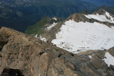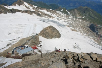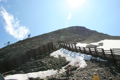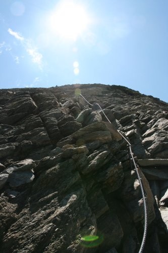 An der Terasse der Bergstation steigen wir über die Leiter in das sandige Gelände steil hinauf bis zu hinter die Lawienschutzzäune. Dort beginnt der versichterte Steig der für erfahrene Bergsteiger kein Problem darstellen sollte. Meist an der Kante steigen wir auf bis der Südgrat erreicht wird. Etwas unterhalb von diesem steigen wir bis zum Gipfelkreuz auf.