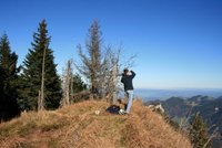 Zurück bis kurz vor die Laubensteinalmen (oder direkt durch die Senke) und weglos und fast senkrecht zum höchsten Punkt aufzusteigen. Dann auf dem ausgesetzten Pfad nach Norden zum Gipfelkreuz steigen.