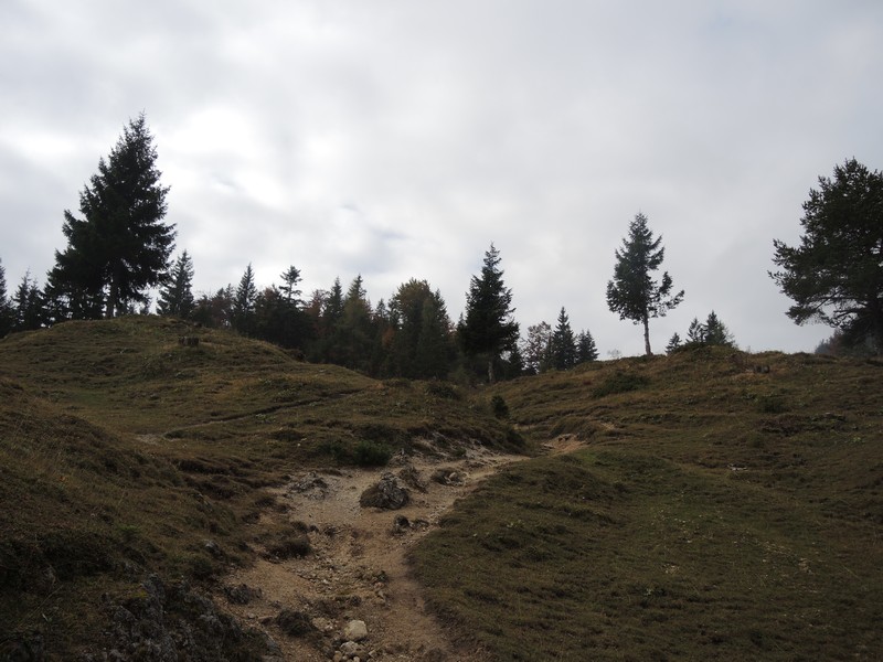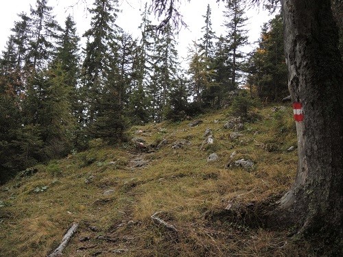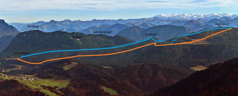 Vom Gasthaus Schneeberg wandern wir kurz auf gleichem Weg wie zum Pendling, wobei nach den letzten Häusern bald ein Forstweg rechts Richtung Höhlensteinhaus leitet. Diesen Wegweisern folgen wir nun eine ganze Zeit. Später ergänzen Wegweiser zur Joch(kopf)alm die Beschilderung. Immer auf Forststraßen mit meist nur mäßiger Steigung und kleinen Gegenanstiegen wird so die Jochkopfalm nach einer knappen Stunde erreicht. Um den Jochkopf östlich herum führt der Wanderweg direkt zum Höhlensteinhaus. Da der Gipfel jedoch so nahe liegt kann es über Pfadspuren mitgenommen werden. Dazu folgt man direkt ab der Hütte den orangen Markierungen bis zum höchsten Punkt, wobei das Gipfelkreuz etwas südlicher zu finden ist. Vom Kreuz geht es kurz zurück, ehe links steile Pfadspuren um den felsigen Gipfelaufbau nach unten leiten und auf der Almfläche des Höhlensteinhauses leiten. Dies ist kurz darauf erreicht. Hier ist etwas Orientierungssinn notwenidg.