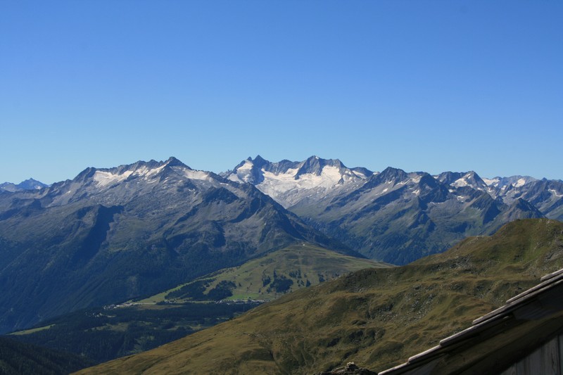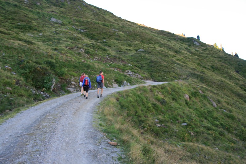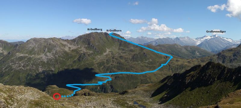 An der Hütte geht man nach Süden und folgt der Beschilderung Richtung Kröndlhorn. Nachdem sich der Weg von dem zum Schafsiedel trennt geht man links Richtung Bach und steigt wenig später zu einer Brücke hinab. Auf der anderen Talseite führt der markierte Pfad nun deutlich steiler hinauf. Einige Höhenmeter schon bewältigt wird der breite Fahrweg zum Salzachjoch erreicht. Diesem folgen wir nun einige Zeit (ein Abkürzer bietet sich an, bringt wohl aber nicht viel). Zwischen der alten Steinhütte und dem neuen Kuhstall der Streitfeldneralm führt links ein Weg nach Südwesten auf das Nadermachjoch. Diesem Pfad folgen wir nun eine Zeit über kleine Bäche hinweg, nehmen jedoch 40 Höhenmeter unterhalb des Sattels links den direkten Weg auf das Kröndlhorn.