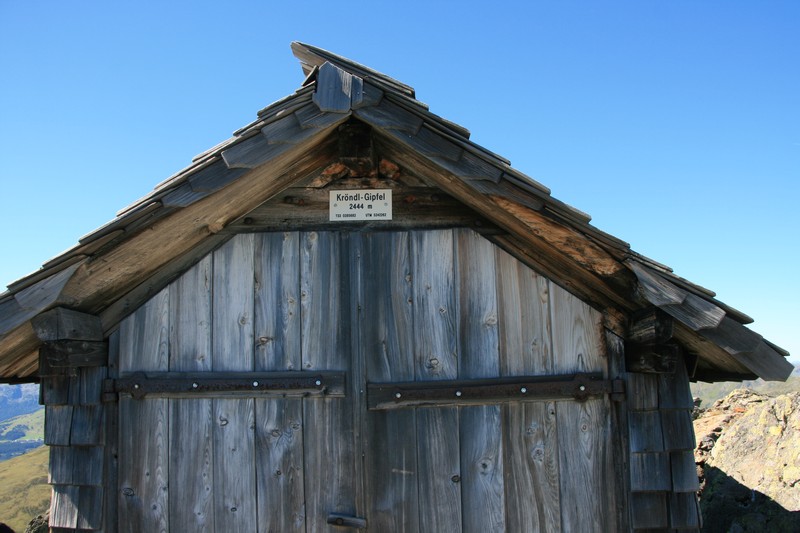 Nochmals wird der Bach gequert, ehe es immer steiler an der Flanke des Berges hinauf geht. Im weiteren Verlauf wird es immer steiler, bis die Gipfelfelsen bereits im Blick sind. Hier steigt man nicht mehr direkt auf, sondern quert auf der Westseite des Gipfels in die Scharte zwischen Kröndlberg und Kröndlhorn. Dabei passiert der Weg erst die Felsen des Gipfelaufbaus und erreicht den Sattel auf einem steilen Pfad, der nicht unbedingt zu den schönsten Wanderwegen zählt. Vom Sattel aus geht man rechts und nach wenigen Augenblicken und minimaler Kraxelei ist der Gipfel mit samt der Kapelle erreicht.