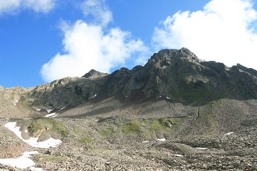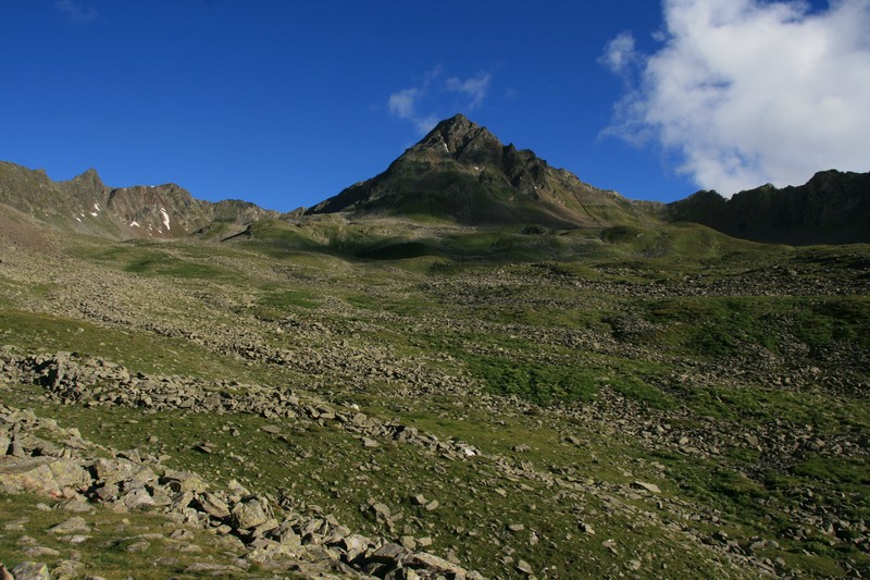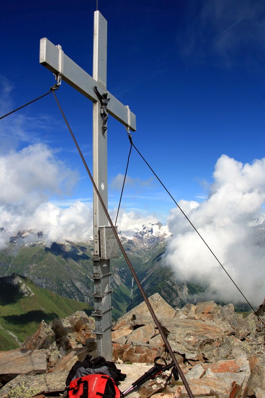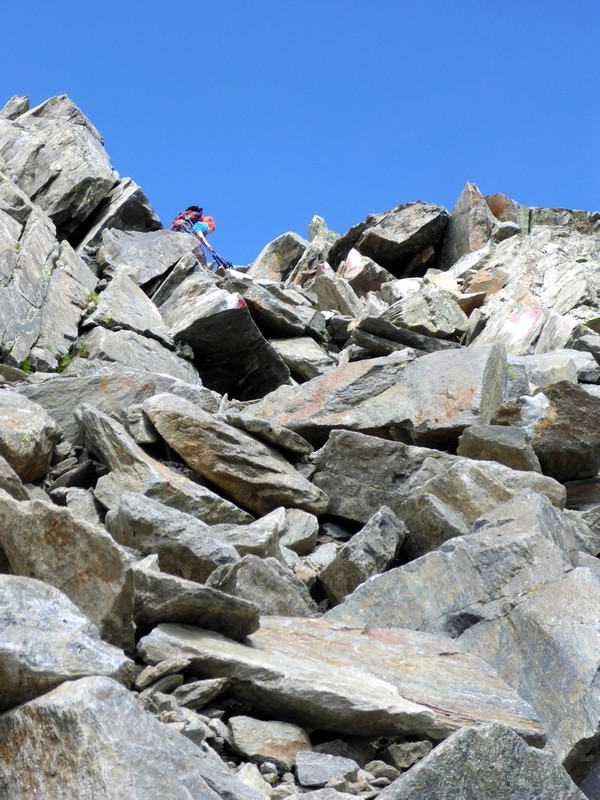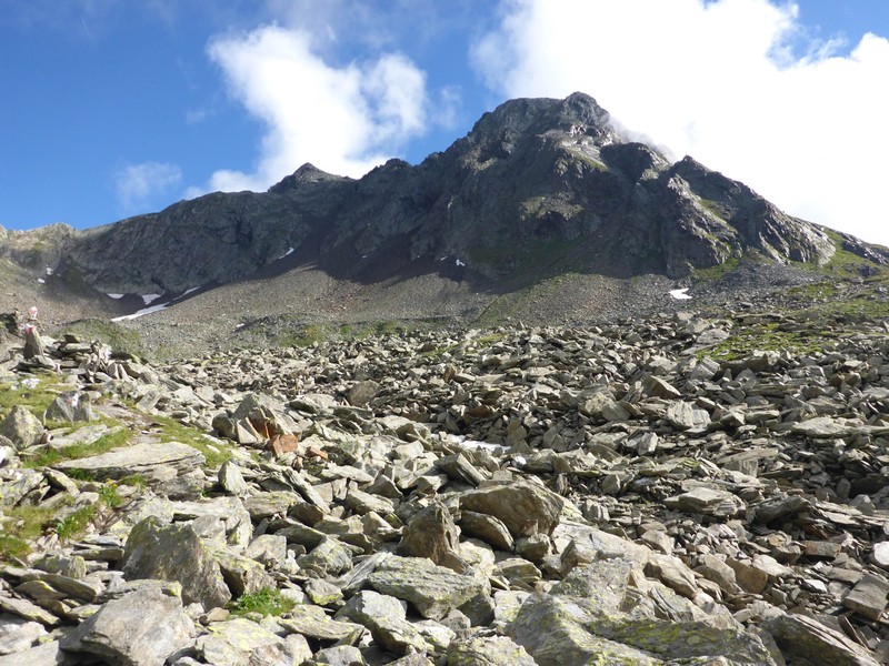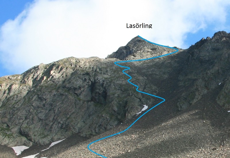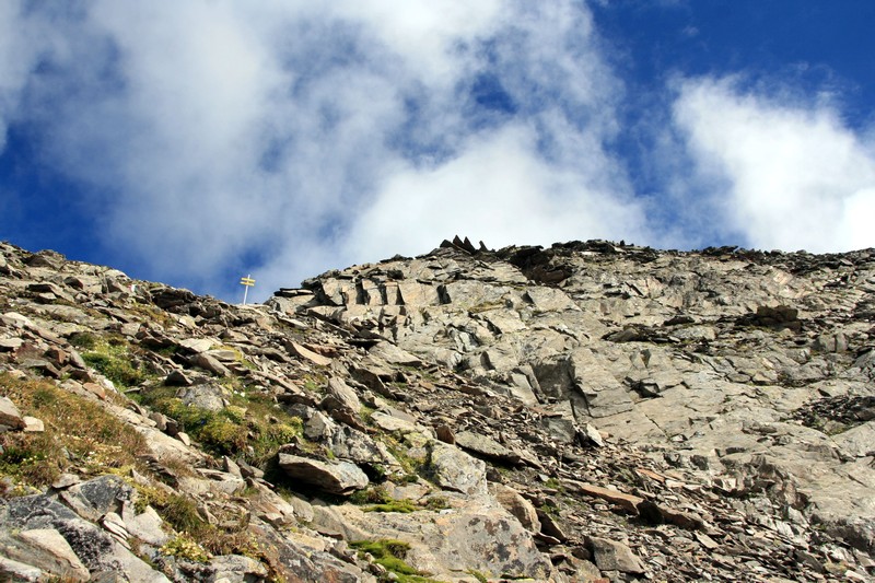Nach der Hütte wird es wieder deutlich flacher. Zunächst über Wiesen, später auch über Geröll zieht sich der Weg immer leicht ansteigend in das Kar hinein. Auf gut 2.600 Metern zweigt dann der Gipfelanstieg rechts ab. Kurz noch geht es über Wiesen, ehe sich der Charakter deutlich ändert: Über loses Geröll werden die letzten 400 Höhenmeter zum Gipfel deutlich anspruchsvoller. Zunächst schlängelt sich der Weg in unzähligen Kehren im Geröllfeld zwischen den Felsen hinauf, ehe sich der Steig mehr nach Südwesten auf den Südgrat hin orientiert. Dorthin ist der Weg wieder deutlicher ausgetreten. Auf etwa 3.000 Metern trifft man auf den Anstieg von der Lasnitzenhütte. Der Weiterweg führt nach Osten auf den Grat zwischen Haupt- und Nebengipfel. Dort angekommen sind es nur noch 10 Minuten zum Gipfelkreuz, zu welchem es mit leichter Kletterei in Gratnähe geht.