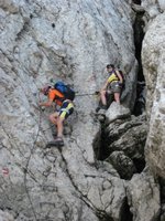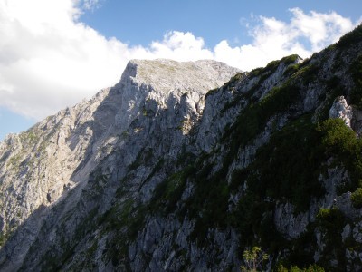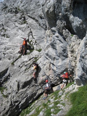 Nach steilen Kehren legen wir vor der ersten heiklen Stelle das Klettersteigset an und steigen um einen Fels gegen den Uhrzeigersinn ab. Südlich des Grates gehen wir meist bergab. Dabei sind die ausgesetzten Stellen nicht mehr modern, aber gut versichert. Den blau-weißen Markierungen folgend gehen wir des öfteren bergauf und bergab. Landschaftlich wunderschön wirkt das Kehlsteinhaus sehr lange so nah, aber ist doch noch so fern. Nach dem Durchschlupf ist das meiste geschafft. Der Klettersteig geht langsam wieder in einen ausgesetzzen Bergsteig über und so schnell wie die Zeit vergeht erreicht man den Kehlsteinrundwanderweg.