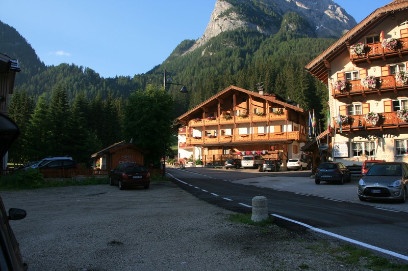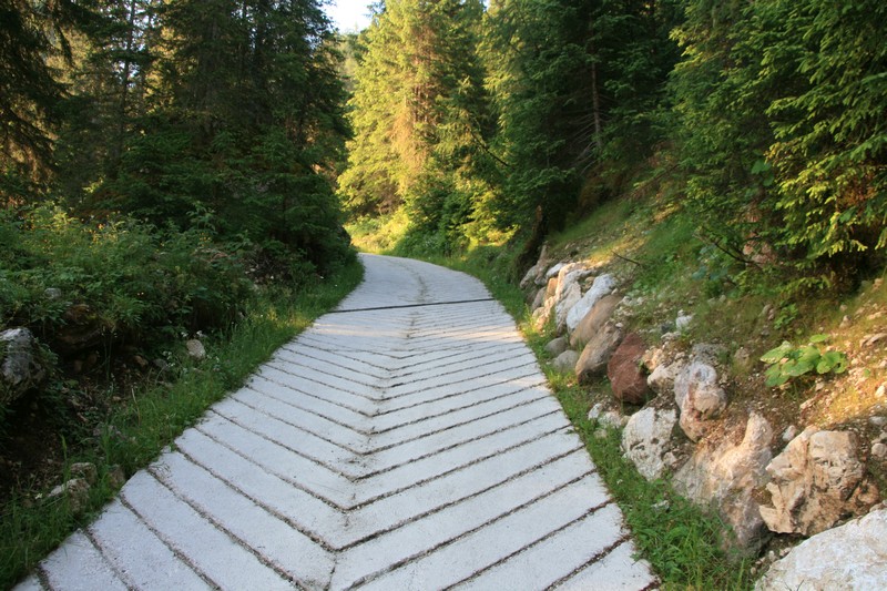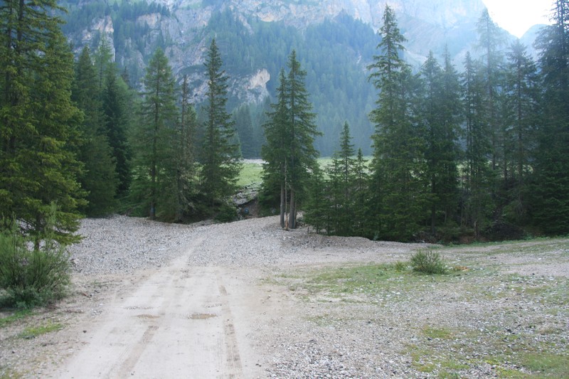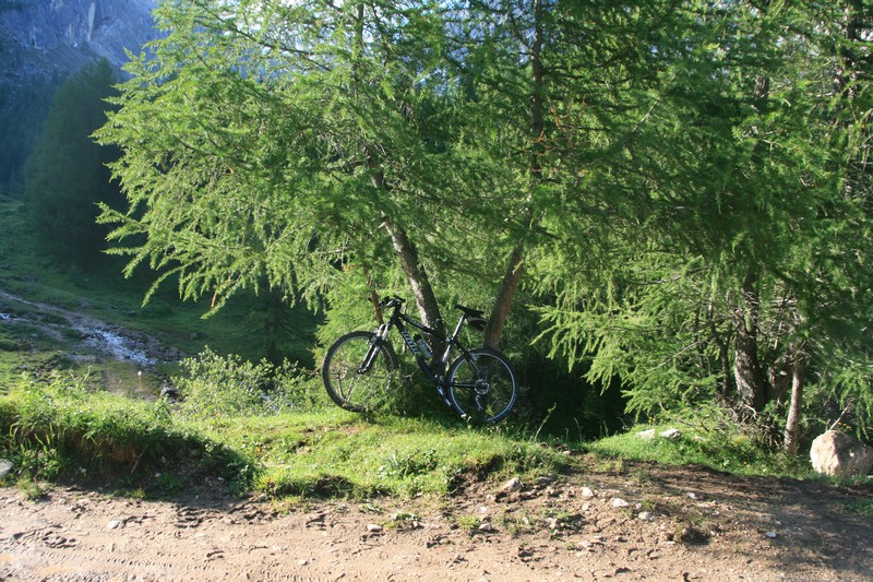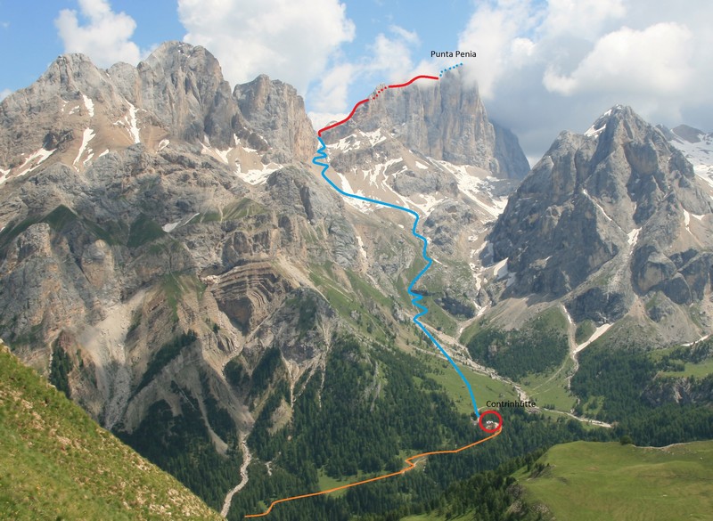 Am großen Parkplatz der Ciampac-Seilbahn am Ortseingang von Penia startet die Tour. Dort folgt man zunächst dem breiten Fahrweg, der zur Contrinhütte (Rifugio Contrin) leitet. Relativ steil gewinnt man so rasch an Höhe. Wenn man wie ich mit dem Mountainbike bis zur Contrinhütte fährt bleibt man stets auf dem Fahrweg, der dort hin leitet. Für Fußgänger gibt es einige Abkürzer. Nach einigen Kehren sind an der Locia Contrin die ersten 300 Höhenmeter geschafft. Das Tal öffnet sich nun zunehmend und der Fahrweg wird deutlich flacher. Mit leichten Gegenanstiegen gelangt man so schnell ins Tal hinein. Auf knapp 1.800 Metern wechselt der Weg die Bachseite. Nun wird der Fahrweg deutlich schlechter. Spätestens ab der relativ neuen Hütte am Wegrand nimmt der Fahrgenuss deutlich ab. Nach einigen weiteren Kehren ist die Contrinhütte erreicht. Hinter dieser ist nun Schluss mit dem biken.