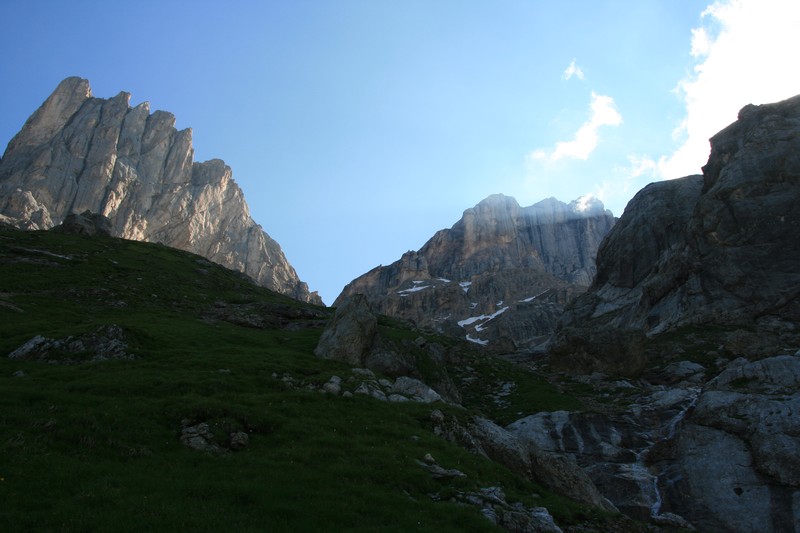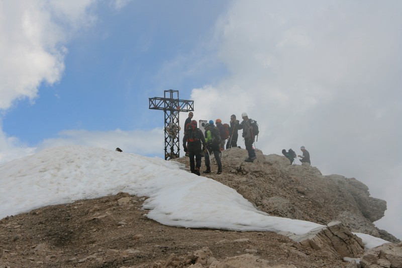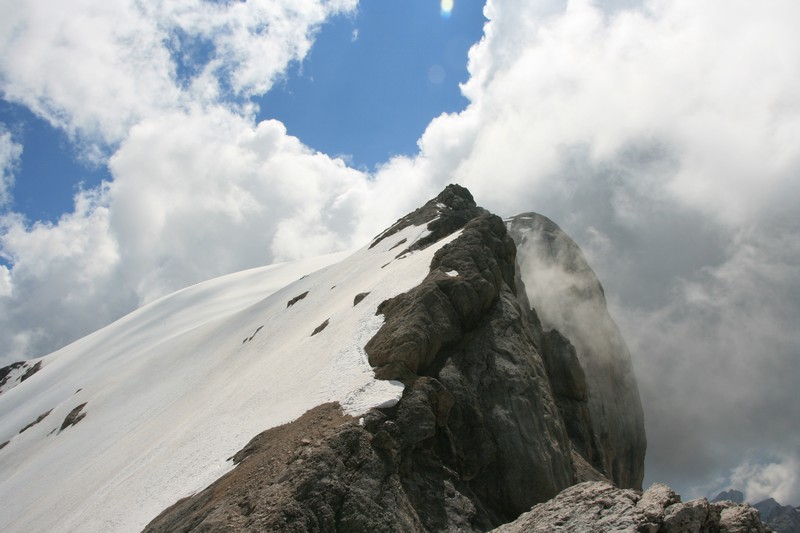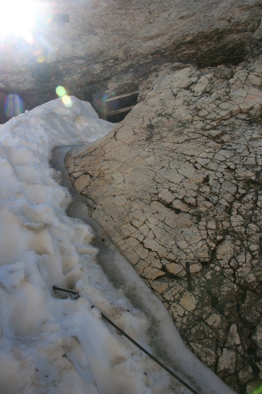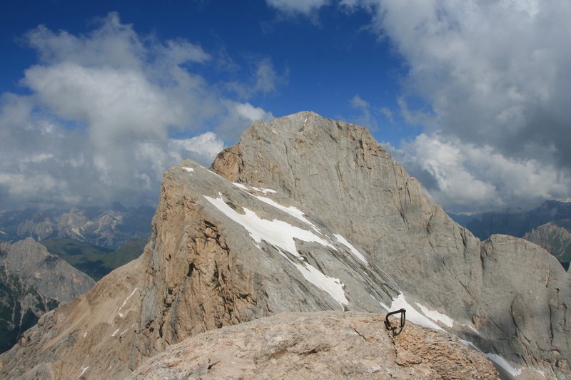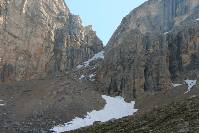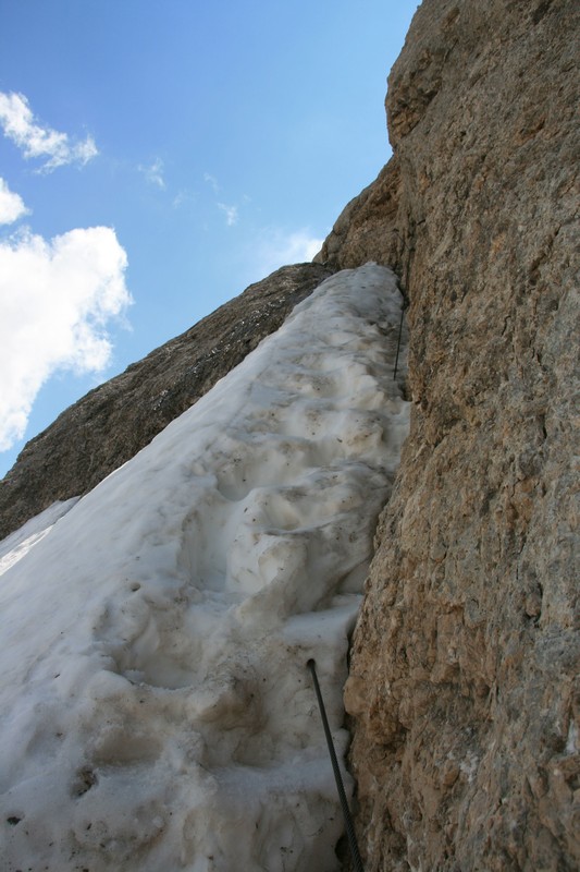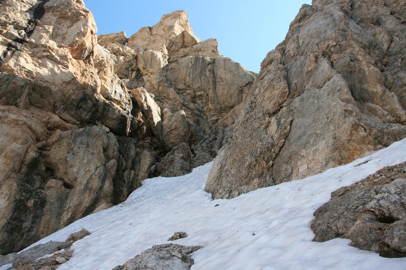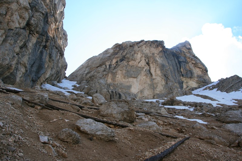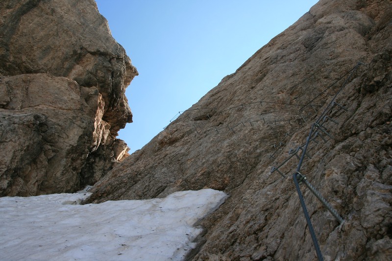 Circa 200 Meter hinter der Hütte verlässt unser Weg den Fahrweg nach links. Über eine Wiese geht es nun meist nur leicht steigend nach Norden. Den Marmolata vor Augen wird der Pfad zunehmen zu einem Bergsteig. Spätestens nach einer Bachquerung schlängelt er sich in Serpentinen nun hinauf. An einer weiteren Wegverzweigung auf 2.400 Metern gehen wir links und kurz darauf lassen wir das Grün zurück und der Aufstieg durch das Geröll beginnt. Was anfangs noch problemlos auf Wegen möglich ist wird mit zunehmender Höhe mühsamer, da sehr viele lockere Steine das Aufsteigen erschweren. Ab einer Höhe von ungefähr 2.600 Metern wurden hierzu Baumstämme als Wegbegrenzung angelegt, die doch etwas helfen. Der Weg wechselt nun an die linke Seite des Tals und mit zunehmender Höhe zieht sich das Kar immer weiter zusammen und wird steiler. Wenn wie in meinem Fall dann noch eisige Schneereste den Weiterweg blockieren erfordert dies einiges an Aufwand Stufen in den gefrorenen Schnee zu schlagen. Die letzten steilen Meter des Kars können durch einen kleinen Klettersteig auf der rechten Seite umgangen werden.