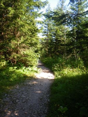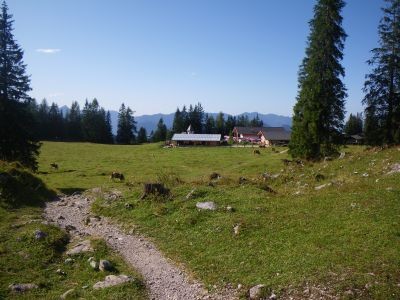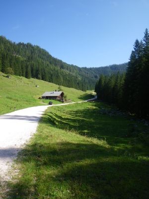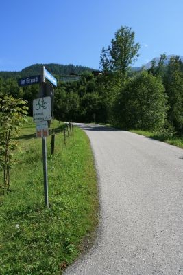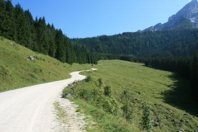 Um an den See zu gelangen stehen die letzten Höhenmeter noch einmal an: Es geht zurück zur Abzweigung vor der Kührointalm . Wir wählen den Auffahrtsweg, aber verlassen diesen schon bald wieder (in der Serpentine bei circa 1.350 Meter). Nach den wirklich letzten Höhenmetern bietet eine Bank Sicht auf Berchtesgaden. Über einen Schotterweg fahren wir nun hinab, an der Weidefläche der Herrenrointalm vorbei, und befinden uns bald an einem Wanderweg außerhalb des Nationalparks. Über diese steile Abfahrt geht es nun hinab bis zur Bob-Rodelbahn. Unten angekommen fahren wir zum Abschluß dieser Tour an den Königssee.