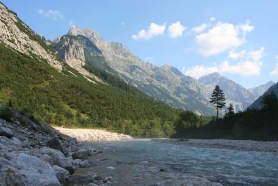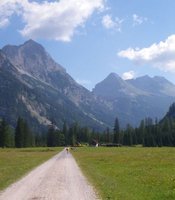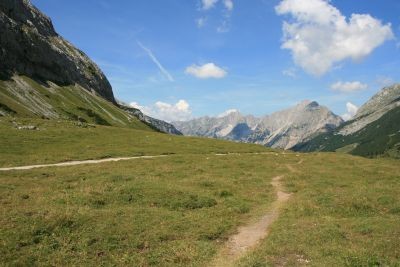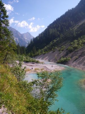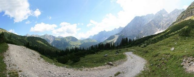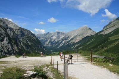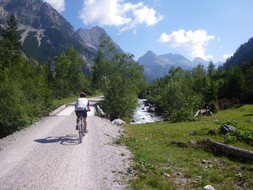 Am Parkplatz überqueren wir die Isar. Die folgende Teerstraße wird bald zu einem Schotterweg. Nachdem die ersten 130 Höhenmeter geschafft sind geht es relativ angenehm ohne große Steigungen zur 1.173 Meter hohen Larchet-Alm. Ein paar Minuten später ändert sich das ganze und spätestens ab der Angeralm muss nun ordentlich zum Karwendelhaus hinauf gestrampelt werden. Nach dem Weidegatter ist die Alpenvereinshütte nicht mehr zu übersehen, doch es sind trotzdem noch ein paar Kehren.