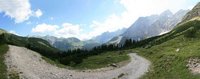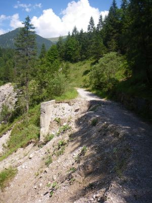 Um nach Hinterriß zu kommen geht es auf den Hochalmsattel. Von dort führt ein sehr schotteriger und steiniger Weg hinab zu einem Denkmal. Über den ausgeschilderten Fahrweg geht es nun mit mehreren kleinen Gegenanstiegen hinab zum Rißbach.