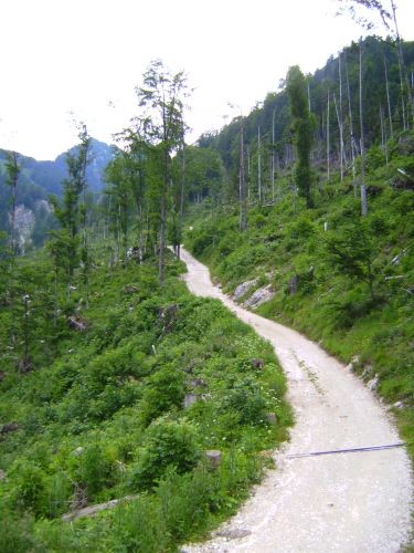 Die Tour wäre wirklich eine Genusstour, wenn das folgende Stück nicht wäre. Auf dem Stück zwischen Aipl und dem Abzweiger zur Mitteralm werden auf einem Kilometer 200 Höhenmeter überwunden (was 20% im Durchschnitt ausmacht). Dieses Stück muss man sich nun einfach duchquälen. Durch den losen Schotter ist es keine Schande abzusteigen und den steilen Teil (ca. 600 Meter) sein Rad hochzuschieben. Die Abzweigung zur Mitteralm liegt auf ungefähr 1180 Metern. Wer nun einkehren will kann dies in der Alpenvereinshütte machen, welche mit dem Rad in 5 Minuten locker erreicht wird.