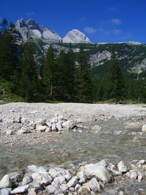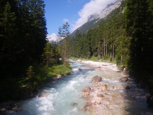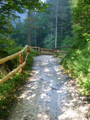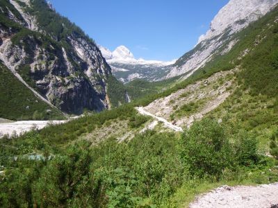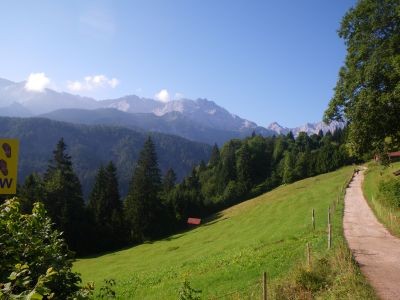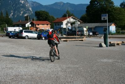 Am Skistadion geht es zunächst Richtung Partnachklamm Taleinwärts auf der Teerstraße. Nach der Brücke geht es rechts in einem Bogen den Berg hinauf. Relativ steil für den Anfang gewinnen wir jedoch schnell Höhenmeter. Schon bald ist die Partnachalm erreicht. Von nun an geht es einige male bergauf und bergab. Wir folgen den Wegweisern der Wettersteinrunde bzw. Richtung Reintal. Kurz vor dem Taleingang geht es den ersten kurzen Trail über einen sehr steinigen Schotterweg hinab. Wir folgen den Wegweisern Richtung Bockhütte. Über einen Wanderweg, der gerade breit genug für einen Quad ist, geht es relativ angenehm durch die Klamm zur ersten Brotzeitstation. Nun beginnt der landschaftlich wunderschöne Weg entlang der Partnach. Da die Reintalangerhütte teilweise mit dem Motorrad versorgt wird wurden auf dem Weg einige male Pflastersteine und Eisen verbaut, welche auch dem Mountainbiker helfen. Die Strecke ist an einigen Stellen doch recht eng und anspruchsvoll, aber fast vollständig fahrbar. Am Wochenenden würde ich jedoch den Trail nicht fahren wollen, da es schon in der Woche wuselte und auch keinen Spaß mach ständig zu klingeln und abzubremsen. Nach einigen kleineren Gegenanstigen ist die Alpenvereinshütte erreicht.