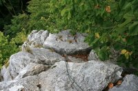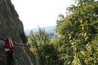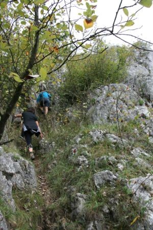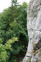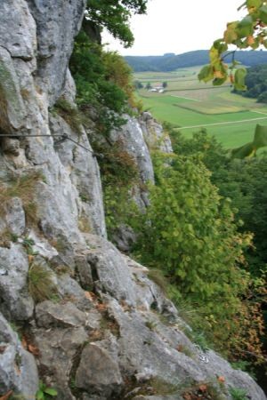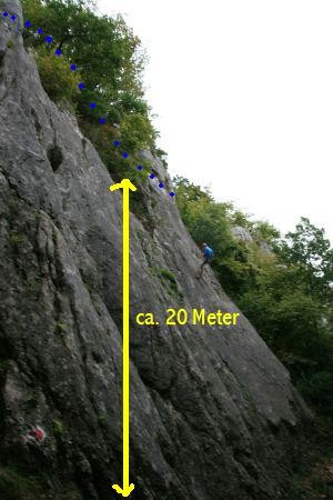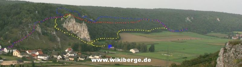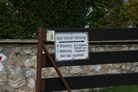 Los geht es am großen Parkplatz unterhalb von Konstein. Von hier aus gehen wir die Straße Richtung Ortsmitte. Die erste Straße biegen wir nun nach Rechts ab (am Transformatorhäuschen), um gleich auf einen Pfad abzubiegen (Bild 1). Nun verläuft der Weg weiter bis die erste leichte Kletterstelle (Bild 2) erreicht wird. Ist diese Überwunden gehen wir weiter bis zu einer Weggabelung. Hier teilt sich der Klettersteig vom Bergsteig. Einen lohnenden Umweg bietet der unmarkierte Weg auf den Dohlenfelsen, wo es rechts hinauf geht. Hier ist äußerste Vorsicht geboten, denn auf beiden Seiten geht es weit genug runter um für immer drunten zu bleiben. Wer nicht auf den Felsen will geht weiter dem Blauen Pfeil folgend bis die in meinen Augen fast schwierigste Stelle des Steigs erreicht wird: Ein Fels ohne Sicherungen (Bild 4). Wenn dieser Teil überwunden ist folgen wir den Blauen Punkten bis es steil bergab geht (Bild 5) und erreichen bald den Einstieg des eigentlichen Klettsteigs. Hier muss nun ein Klettersteigset angelegt werden, denn es geht teilweise an die 20 Meter senkrecht bergab (Bild 9.)