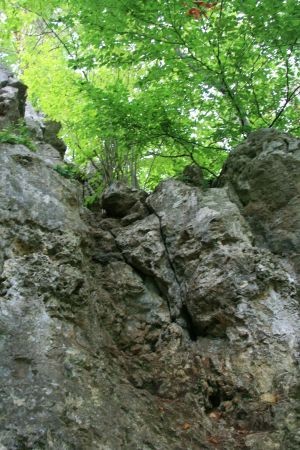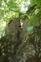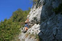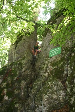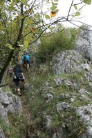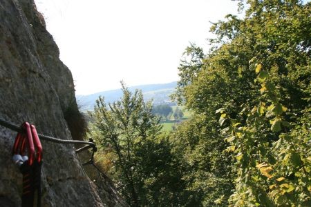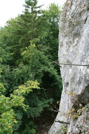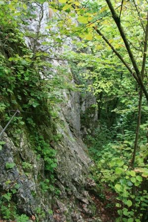 Der Klettersteig ist an manchen Stellen recht speckig, aber verfügt durchgehen über ein Stahlseil, in welches man sich einhaken kann. Gleich zu Beginn muss man sich überwinden, da es scharf um die Kurve geht (Bild 7 ist ein Rückblick). Weiter geht es auf Eisenstäben, bis nach 10 bis 15 Minuten das untere Ende erreicht wird (Bild 12). Nun gehen wir weiter den Markierungen folgend bis nach wenigen Minuten der nächste Fels zu sehen ist. An ist ebenfalls ein Klettersteigset anzulegen. Der zweite Fels ist ca. halb so lang wie der vorherige und nicht schwerer. Wem es zu viel wird kann dort an einigen Stellen aus dem Steig austreten, da er oft nur wenige Meter über dem Boden verläuft (Bild 13 bis 15).
