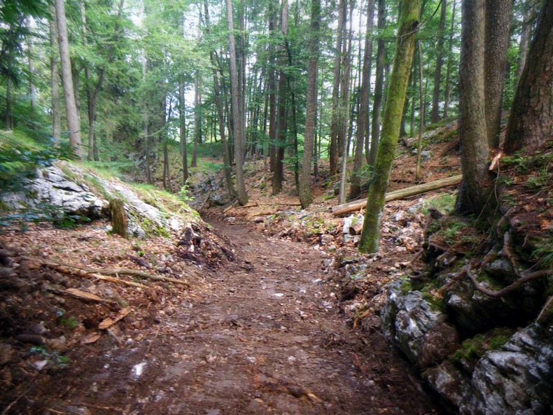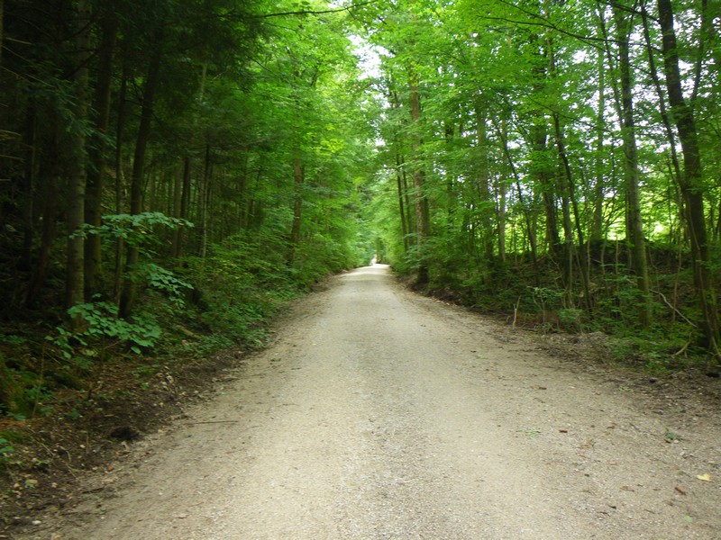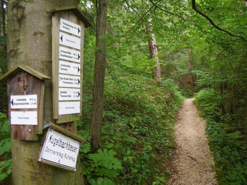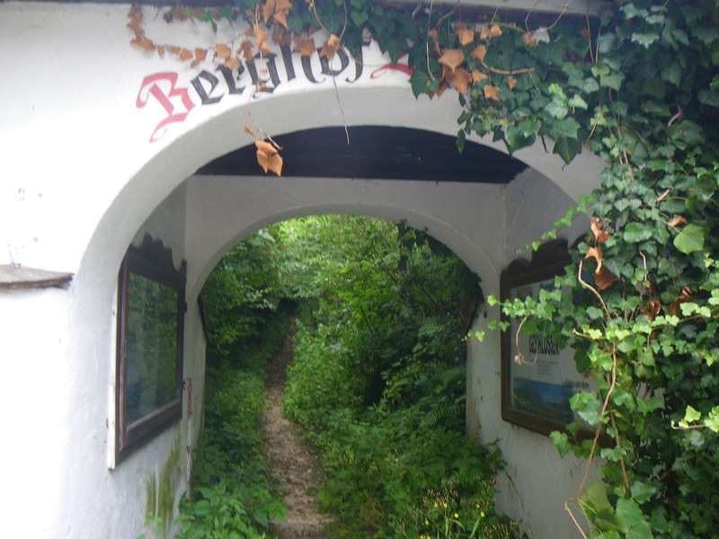 An der Predigtstuhlbahn geht man kurz der Straße bergauf folgend, bis rechts durch einen Torbogen ein Weg zur ehemaligen Wirtschaft Schroffen führt. Teils schon ziemlich verwachsen ist die Wirtschaft nach wenigen Minuten erreicht. Links von dieser führt ein Weg in den Wald, der sich nach wenigen Metern verzweigt. Wir gehen rechts Richtung Paul-Gruber-Haus führt. Dabei geht es nun auf einem Höhenweg mit Blick auf Bad Reichenhall zunächst bergauf, später bergab und nach einer guten viertel Stunde ab der Wirtschaft erreicht man nach weiteren, beschilderten Verzweigungen den breiten Fahrweg das Tal hinauf. Hier links gehend führt die Straße an der Wirtschaft Kugelmoosbauer vorbei. Nun etwas steiler bleibt man auf dem breiten Weg bis nach 60 - 90 Minuten das Naturfreundehaus erreicht ist.