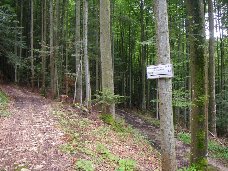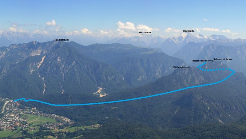 Direkt hinter dem Paul-Gruber-Haus zweigt links ein Weg ab, der sich wenige Meter später nochmals verzweigt. Hier geht es ebenfalls links weiter. Der Weg ist hier am Anfang breit ausgebaut, dass hier sogar noch ein Jeep fahren könnte. Mit zunehmender Höhe wird geht er in einen Bergsteig über. Er wechselt dabei auf die Südseite des Rabensteinhorns, von wo aus sich gute Tiefblicke auf die Saalach und hinüber zur Reiteralm eröffnen. Über steiles Grasgelände erleichtern Stahlseile hierbei das Weitergehen. Ohne Schwindelfreiheit und entsprechende Trittsicherheit geht es nicht auf die Ostseite des Kamms. Hier wird das Gelände wieder deutlich flacher. Den Rotweißen Markierungen folgend wird bald eine Verzweigung erreicht. Hier geht es links über eine Steinmauer und weiter "zum Gipfel". Damit ist das Pflasterbachhörndl gemeint. Um dieses zu erreichen schlängelt sich der Weg mit kurzem Gegenanstieg auf den Sattel zwischen Müllnerhorn und Rabensteinhorn hinauf. Von dort geht es weiter nach Süden auf den unscheinbaren Gipfel des Pflasterbachhörndls.