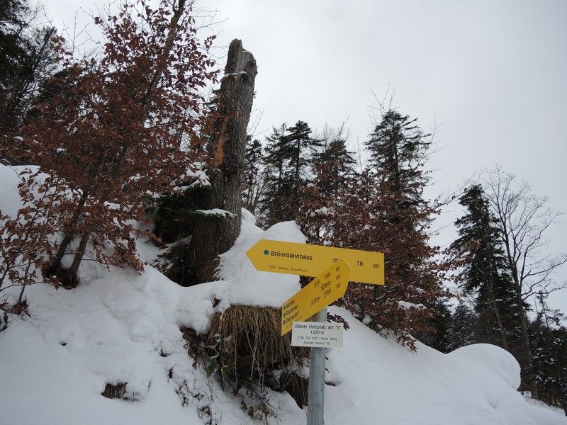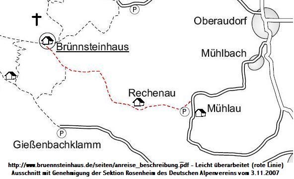 In Mühlau wählt man den Forstweg links des Parkplatzes. Auf diesem geht es den Wegweisern folgend bis zur Straße kurz unterhalb der Rechenau. Hier ist bei der Abfahrt das Rodeln verboten. Am Hof geht es vorbei auf den Weg in den Wald. Hier gibt es nochmal ein flaches Stück. An sämtlichen Wegverzweigungen ist der Weg ausgeschildert. Nach dem flachen Stück wird es nun steil, was sich bis zur Wiese vor dem Brünnsteinhaus nicht mehr ändert. An der Wiese auf dem Weg bleiben, etwas hinabgehen, um kurz vor dem Haus nochmal einen steileres Stück zu meistern. Nun sieht man das Brünnsteinhaus.
