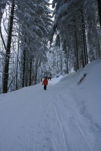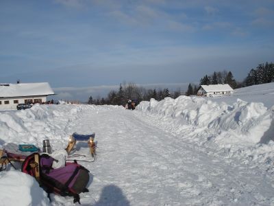 Die Abfahrt beginnt an den Daffnerwaldalmen. Nach 2 Spitzkehren wird es bald ruhiger, denn ein Großteil nimmt ja bekanntlich auch gerne den kürzeren Weg von Schweiber. Nach steileren Kehren wird es nach dem freien Stück deutlich flacher. In Kurven verlangsamt sich der Schlitten weiter, bis es vor Kirchwald endlich wieder steiler wird. An der Kirche fahren wir vorbei, lassen den direkten Weg nach Nußdorf rechts liegen. Auf dem Rodel geht es weiter rasant hinab, ehe man am Waldrand oberhalb des Ortes landet. Mit dem Schwung geht es über die Wiese, ehe man durch den Ort zurück zum Parkplatz geht.