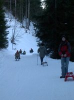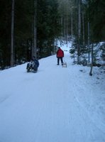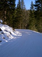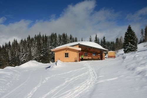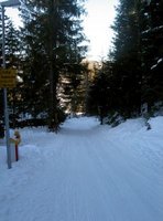 Zu Beginn gehen wir hinter dem Gasthof links, und folgen dem Weg zwischen den Häusern hindurch. Bald verschwindet der Weg im Wald und dort bleiben wir nun auch die nächste Stunde. Wenn alle Aufsteigenden am Rand gehen ist der Weg meist breit genug. Im Winter ist es fast unmöglich sich dabei zu verlaufen, was an der geräumten Piste, aber auch an den Menschenmassen liegt. Nach einer bis eineinhalb Stunden ist das Ziel - die Kala-Alm - erreicht.