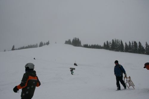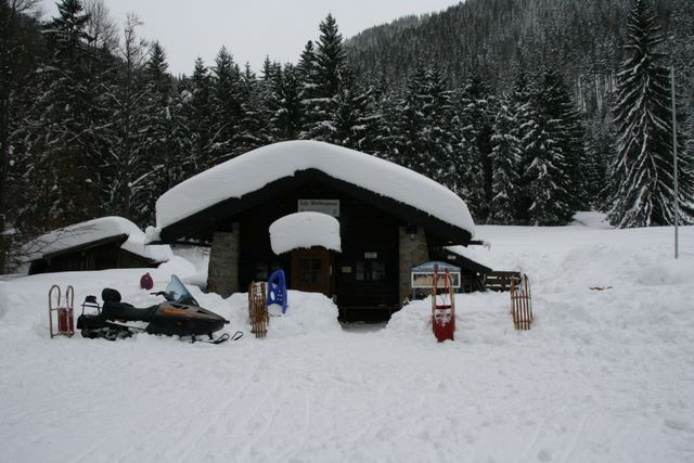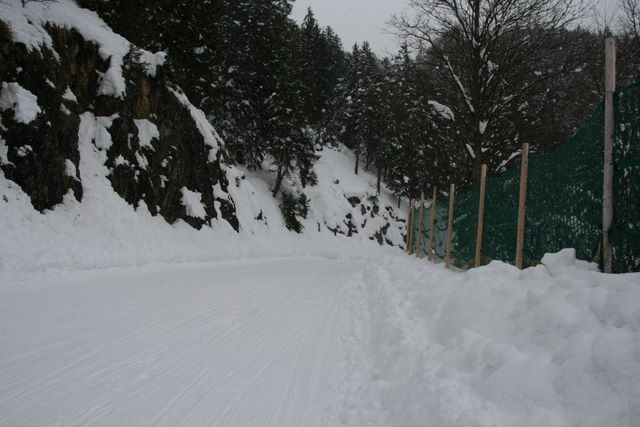 Hoch geht es erst einmal mit der Gondelbahn, die etwas unterhalb des Wallbergs ihre Bergstation hat. Von dort schlängelt sich die ausgeschilderte Bahn Richtung Wallberghaus nach Süden. In einer starken Rechtskurve führt der Weg nun bis zum Ende des Schlepplifts auf den Setzberg, der jedoch nicht mehr in Betrieb ist. Wir rodeln nun erst einmal in den Wald und queren nach wenigen Minuten eine breite Waldschneiße. Nach dieser wird es nun steiler und die gefährlichste Stelle naht in meinen Augen. Nach einem steilen Stück macht die Rodelbahn in einer engen Spitzkehre einen Linksknick. Schon bald erreichen wir wieder die Waldschneiße und rodeln ab hier gemächlich bis zum Cafe Wallbergmoos. Da die Abfahrt so lange ist, verwundert es nicht, dass viele Schlitten vor der kleinen Hütte stehen (und Pause machen). Ab der kleinen Wiese rodeln wir auf der tief eingeschneiten Wallbergmautstrße, die im Winter gesperrt ist. Die letzten Kilometer (allein diese Aussage ....) verlaufen nun meist leicht fallend bis zum Ende der Rodelbahn an der Talstation der Gondelbahn .