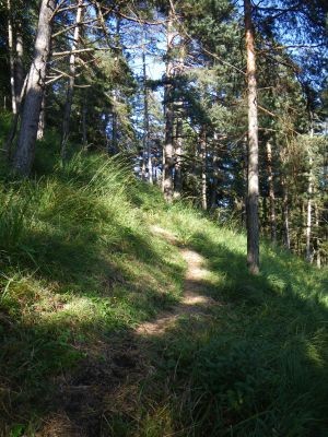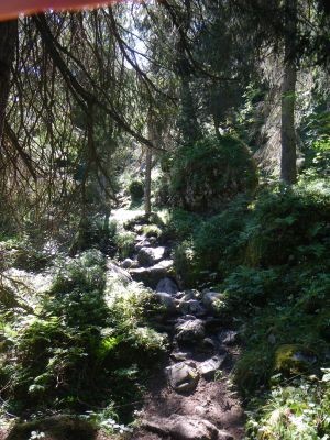 Wir parken kurz vor dem Kraftwerk und wandern zunächst gemütlich über die Straße nach Norden, bis ein gelber Wegweiser über eine Wiese nach rechts leitet. Nach einem kurzen Stück auf einer glitschigen Holzrampe und zwei Holzbrücken wird der Weg deutlich steiler. An der bald erreichten Weggabelung gehen wir gerade aus Richtung Steinapfelsteig. Nun deutlich steiler steigen wir nach Nordosten auf. Nach einigen Kehren zieht sich der Weg weiter nach Nordwesten und überquert dabei zwei Bäche. Nach den letzten Kehren erreichen wir auf circa 1.200 Höhenmeter einen Holzarbeiterplatz und gehen auf der anderen Seite weiter, bis nach weiteren Kehren im Wald ein Fahrweg erreicht wird.
