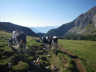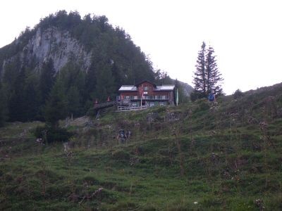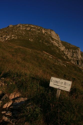 Hier gehen wir links und folgen dem Weg nun einige Kehren, bis in einer Kehre ein Pfad (mit Wegweiser) beginnt. Dieser leitet nun wieder im Wald, aber dafür deutlich flacher empor. Wenn das Läuten der Kuhglocken lauter wird und wir den Wald verlassen sieht man schon am oberhalb des Hangs die Bayreuther Hütte. Um zu dieser zu gelangen gehen wir kurz auf dem Fahrweg und folgen anschließend einem Pfad über den Hang hinauf. Zuletzt wandern wir wieder gemütlicher auf dem Wirtschaftsweg zur Alpenvereinshütte, die als Stützpunkt der Zweitagestour dient (Bis hierher circa 2,5 Stunden).