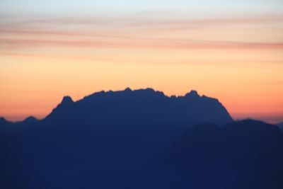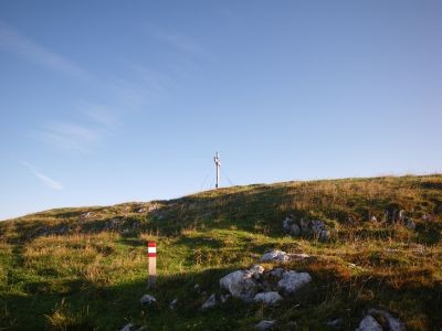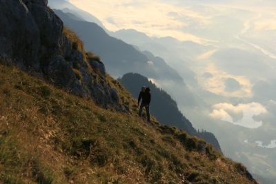 Am nächsten Morgen gehen wir um die Hütte herum, und folgen dem Pfad Richtung Vorderem Sonnwendjoch. Der Weg quert auf die Nordseite, des Berger-Köpfls, wechselt jedoch bald auf die Seite des Inntals, wo die Felsen nun zur gemütlichen Rast bei Sonnenaufgang einladen. Nach diesem Spektakel wandern wir weiter dem Rücken folgend hinauf. Kurze Passagen sind dabei gesichert. Nach 1,5 Stunden ist das Vordere Sonnwendjoch erreicht.