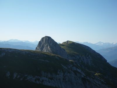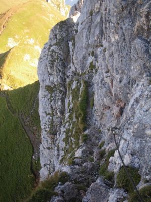 Der weitere Weg ist durch das Gelände vorgegeben. Etwas unterhalb des Grates führt ein Pfad über die Wiese nach Norden. Von diesem nehmen wir noch kurz den Sagzahn mit, welcher wenige Augenblicke abseits vom Weg liegt. Von diesem erfolgt der Abstieg zurück auf den Grat über dessen Nordseite auf dem Sagzahn-Klettersteig (Eher gesicherter Steig - Schwierigkeit B, jedoch überwiegend A). Von dort geht es weiter nach Norden, bis ein Pfad direkt zum Gipfel der Rofanspitze leitet.